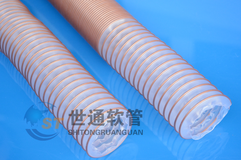 顏色: 半透明PU管壁, 帶鍍銅色包塑鋼絲螺旋加強(qiáng)(壓縮型)